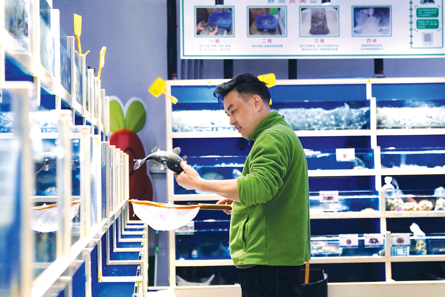 A Dingdong Maicai worker handles a fish at a warehouse in Shenzhen. (PROVIDED TO CHINA DAILY)