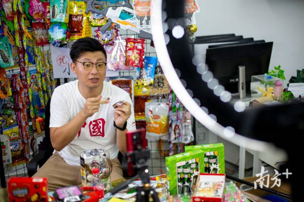 Turn on two flash lights and hold the phone on a tripod, Hong Kong youth Zeng Paangcoeng is doing a livestreaming sale of snacks.