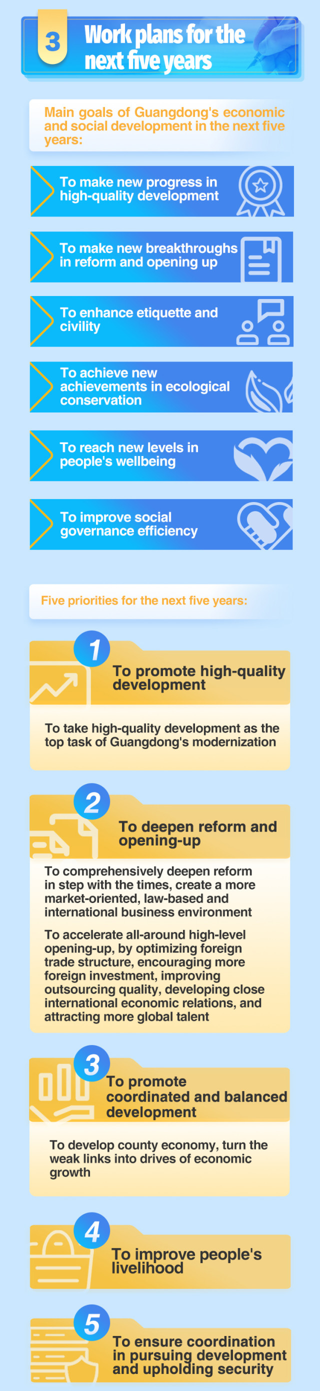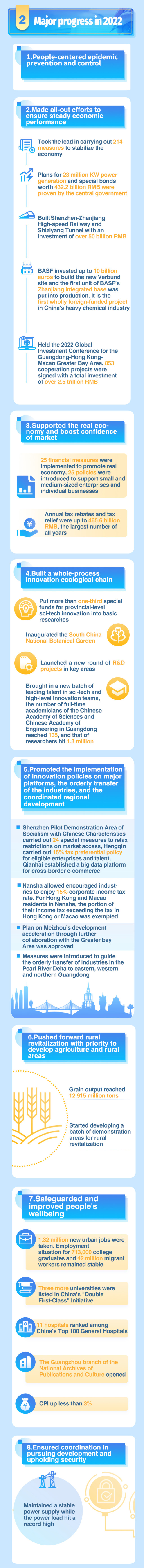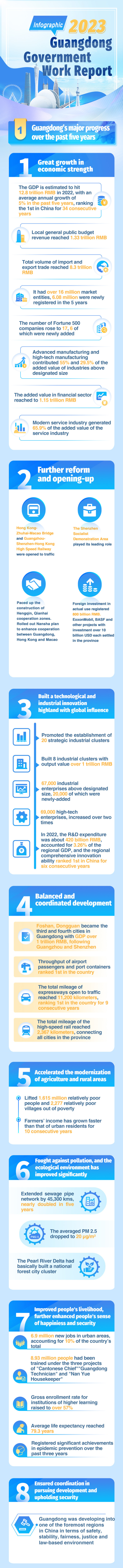 According to 2023 Guangdong Government Work Report delivered on January 12, Guangdong's GDP is estimated to hit 12.8 trillion RMB in 2022, a year-on-year increase of 2 percent, ranking the first in China for 34 consecutive years. Let's take the infographics to know more about the report.