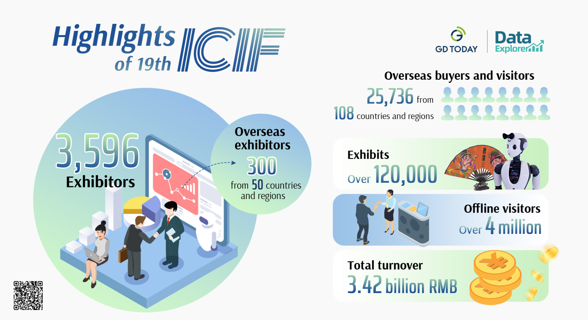 A total of 3,596 exhibitors participated in the five-day event online and offline, including more than 300 overseas exhibitors from over 50 countries and regions. More than 120,000 pieces of cultural products were exhibited, gathering 25,736 overseas buyers and visitors from 108 countries and regions.