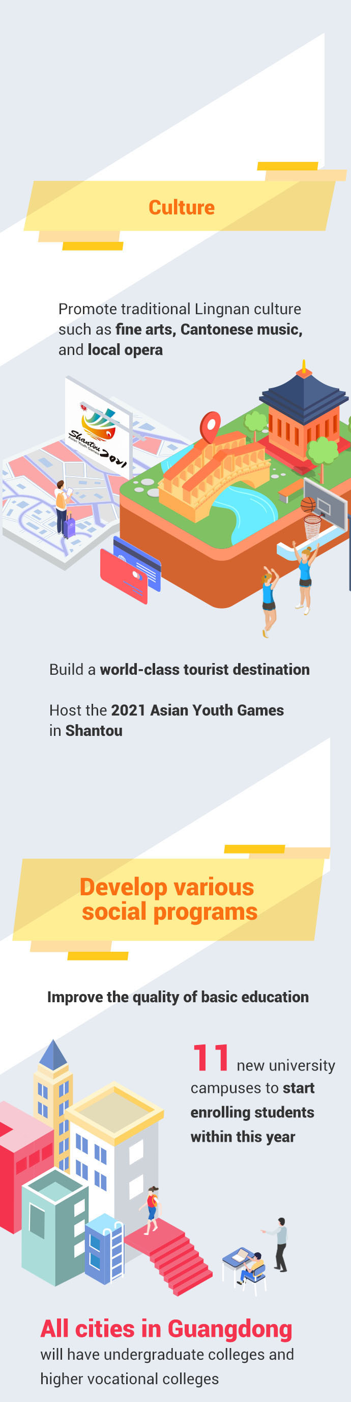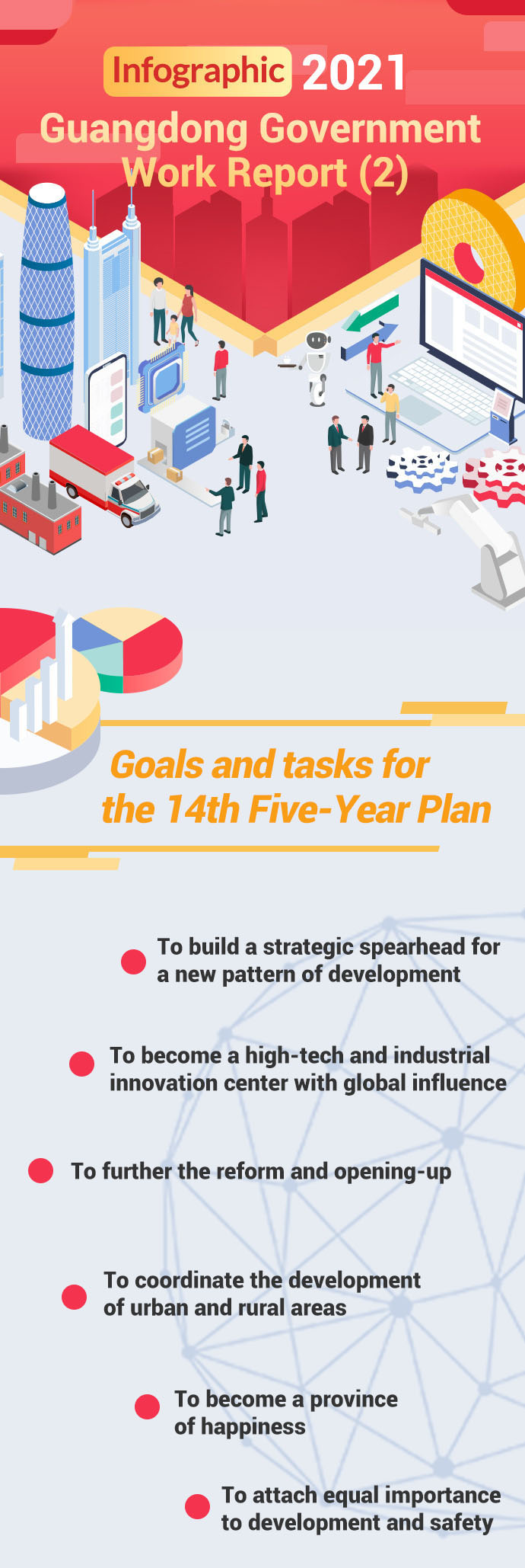 Ma also proposed Guangdong's 14th Five-Year Plan in his work report. In 2021-2025, Guangdong aims to build a strategic spearhead for a new pattern of development, to become a high-tech and industrial innovation center with global influence and further the reform and opening-up. At the same time the province will continue to coordinate the development of urban and rural areas, and make effort to become a province of happiness and attach equal importance to development and safety.