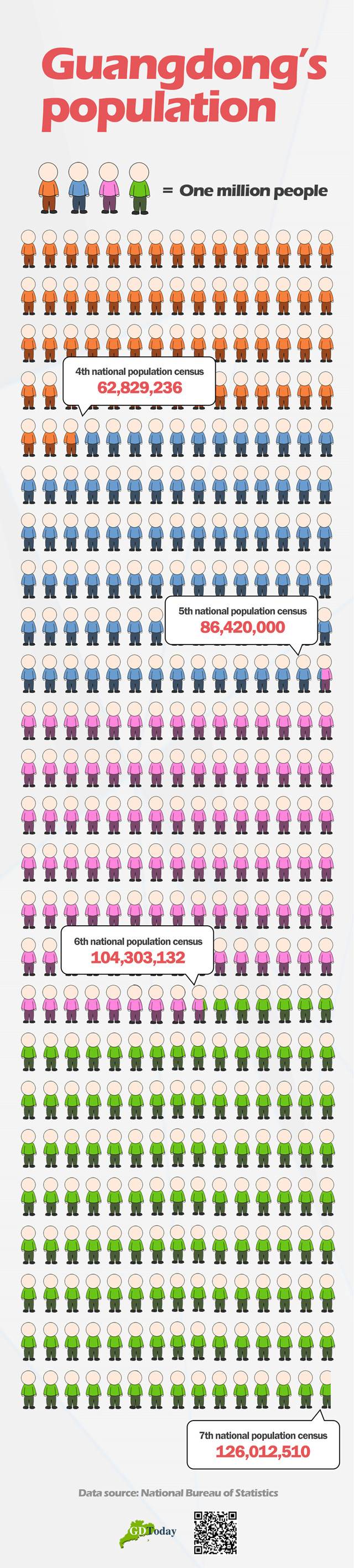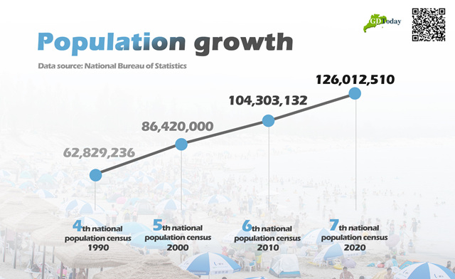 According to the 7th national census released by National Bureau of Statistics, Guangdong has been China’s most populous province for 14 years in a row with 126.01 million people, accounting 8.93% of the country’s total population (1.41 billion).