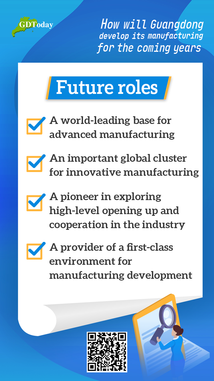 Guangdong is also expected to build pillar and emerging industrial clusters, practice "green", low-carbon development, improve product quality, and optimize business environments for enterprises, among others.