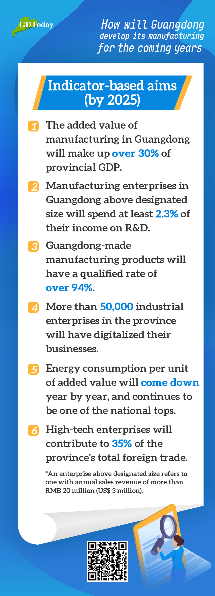 The overall goals give visions of Guangdong manufacturing industries in 2025 and 2035, where Guangdong will manage to be one of the world-class bases as well as manufacturing core areas. The specific goals, which are mainly indicator-based, include manufacturing's proportion in provincial GDP, R&D investment ratio for enterprises and product qualified rate.