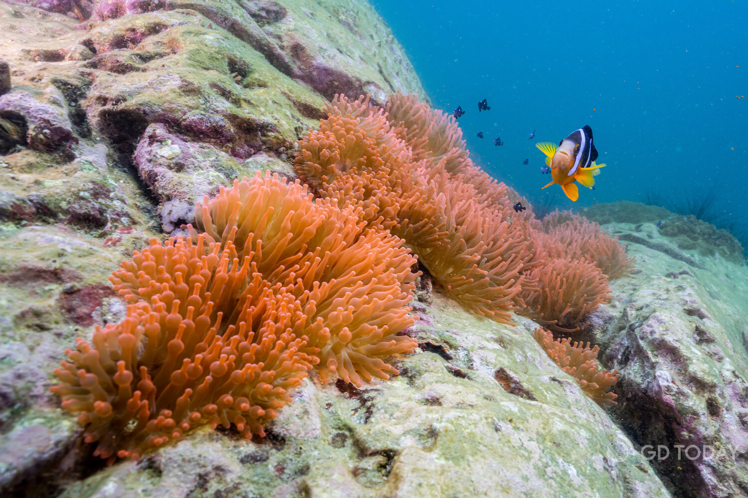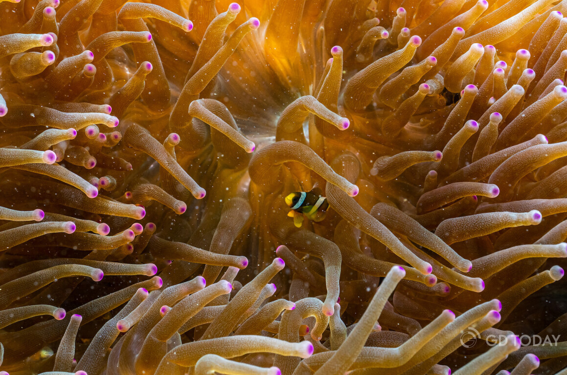 In the waters around Wailingding Island in Zhuhai, a diver swims alongside Clark's anemonefish.