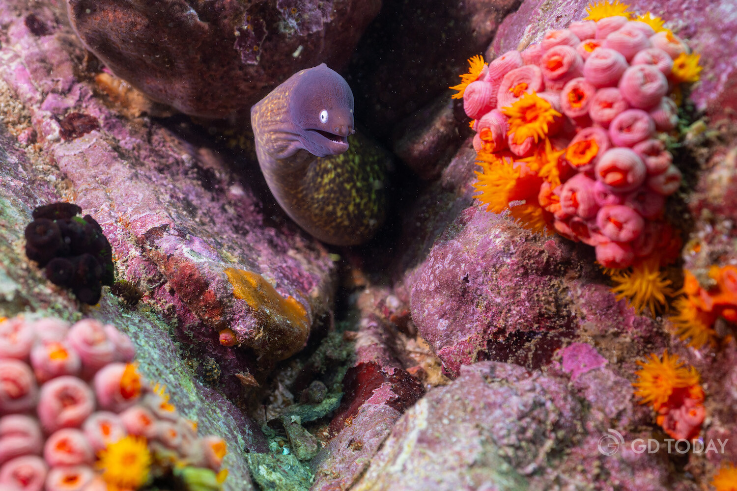 A greyface moray eel hides in a rock crevice between corals, waiting for prey.