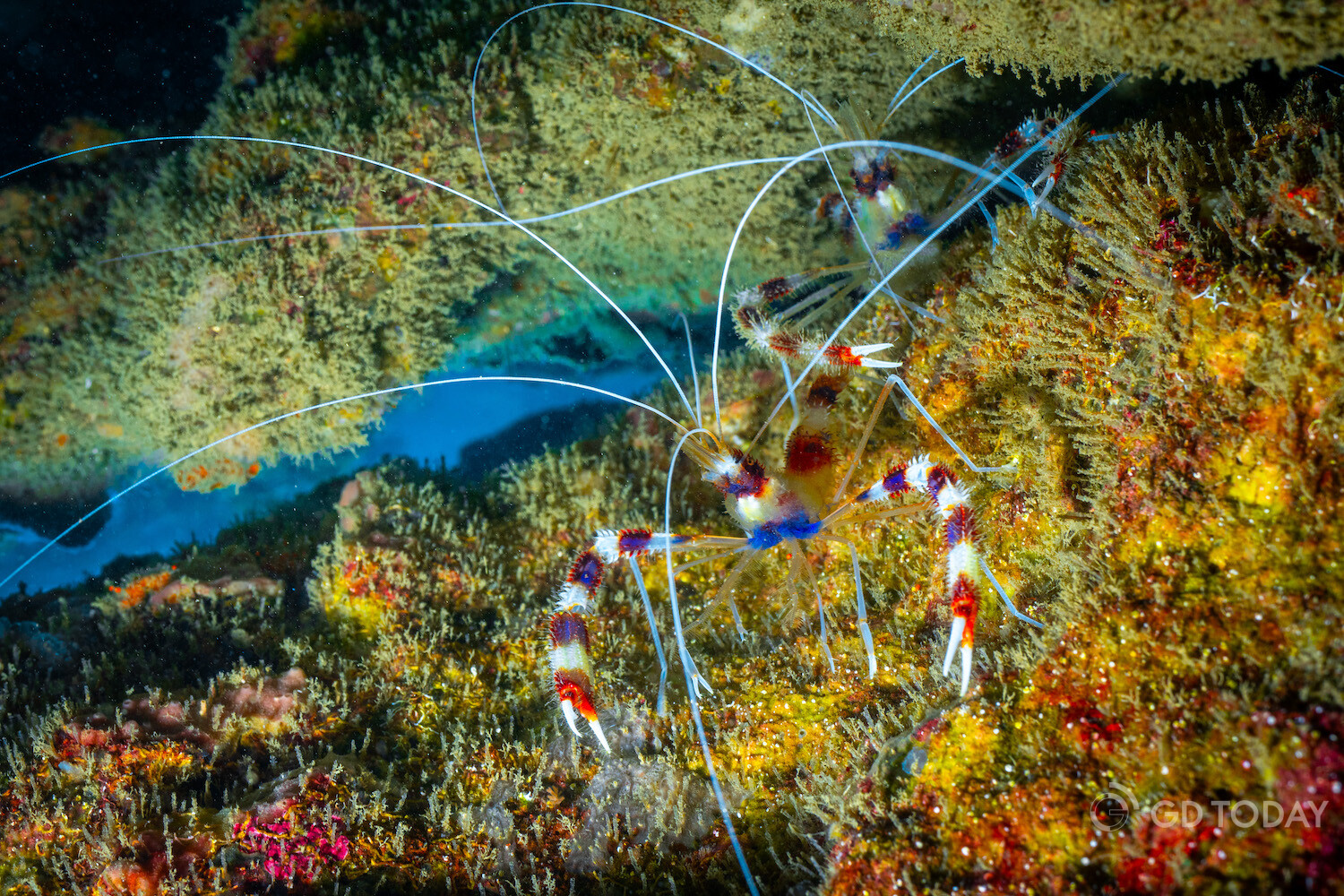 Banded coral shrimps wave their claws as they feed on microorganisms in the water currents beneath the coral reefs in the waters around Wailingding Island in Zhuhai.