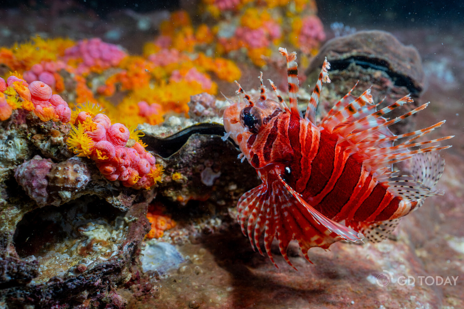 A lionfish with its "luxurious costume" playfully swims among the corals.