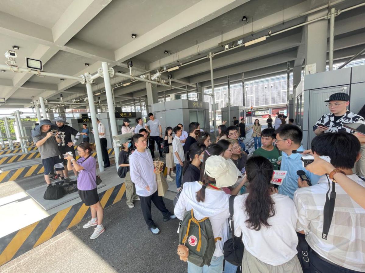 采風團在大橋珠海口岸出境通道一道閘與珠海市商務局副局長王偉交流,了解政策實施情況