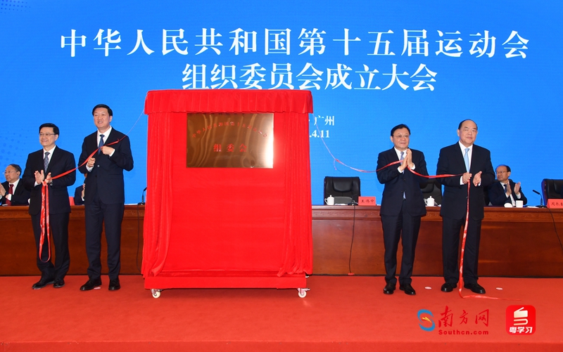 羊城四月,春暖花開。4月11日,中華人民共和國第十五屆運動會組織委員會成立大會在廣州舉行。會上,國家體育總局局長、黨組書記高志丹,中央港澳辦、國務院港澳辦分管日常工作的副主任周霽分別做講話并提出工作要求。廣東省委副書記、省長王偉中,香港特別行政區行政長官李家超,澳門特別行政區行政長官賀一誠分別通報了三地籌辦工作情況。國家體育總局黨組成員、副局長劉國永宣讀組委會名單。高志丹、王偉中、李家超、賀一誠共同為第十五屆全國運動會組織委員會揭牌。