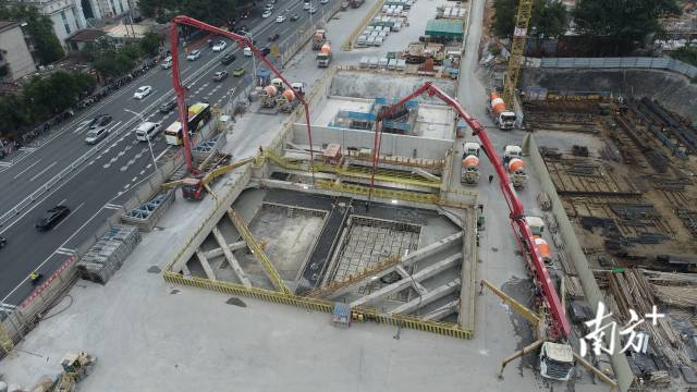 為確保施工安全,廣州地鐵會同中鐵建華南建設廣花城際總承包部、中鐵十八局等參建單位多次邀請行業專家“問診把脈”,深入分析和優化施工組織方案,并重點加強基坑變形、周邊地下水位情況的科學監測,有效控制基坑變形。同時,采用微差爆破與靜力爆破相結合的方式,降低施工對周邊建筑和管線的影響,確保車站周邊建構)筑物結構安全穩定。