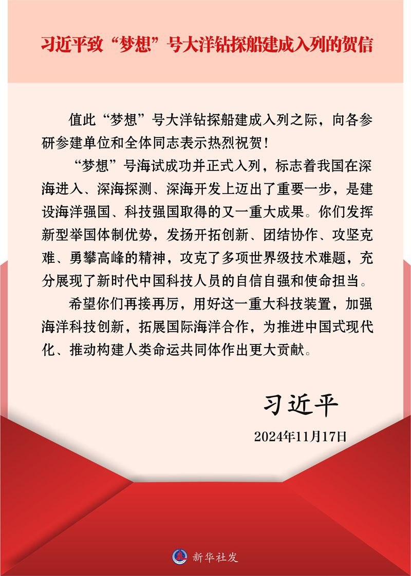 習近平在賀信中指出,“夢想”號海試成功并正式入列,標志著我國在深海進入、深海探測、深海開發上邁出了重要一步,是建設海洋強國、科技強國取得的又一重大成果。你們發揮新型舉國體制優勢,發揚開拓創新、團結協作、攻堅克難、勇攀高峰的精神,攻克了多項世界級技術難題,充分展現了新時代中國科技人員的自信自強和使命擔當。
