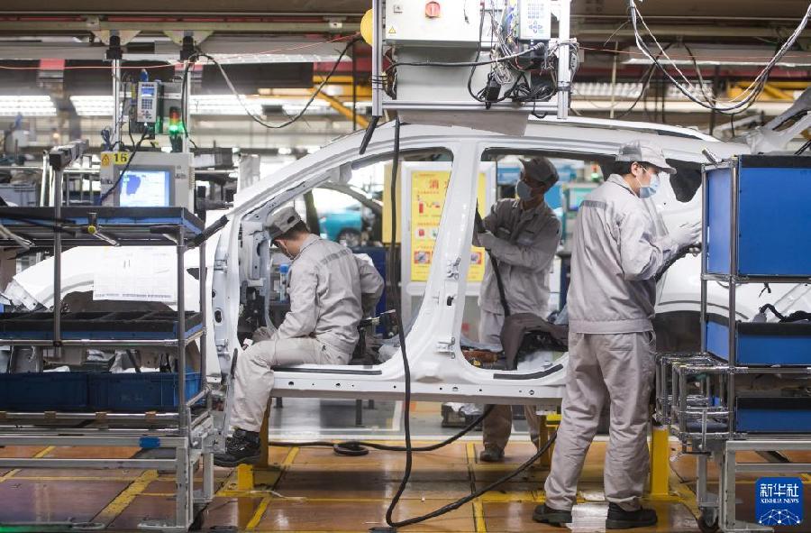 2020年3月24日,工人在湖北武漢東風乘用車公司工廠總裝車間的流水線上作業。2020年3月下旬左右,武漢各企業開始陸續復工復產。新華社記者 肖藝九 攝
