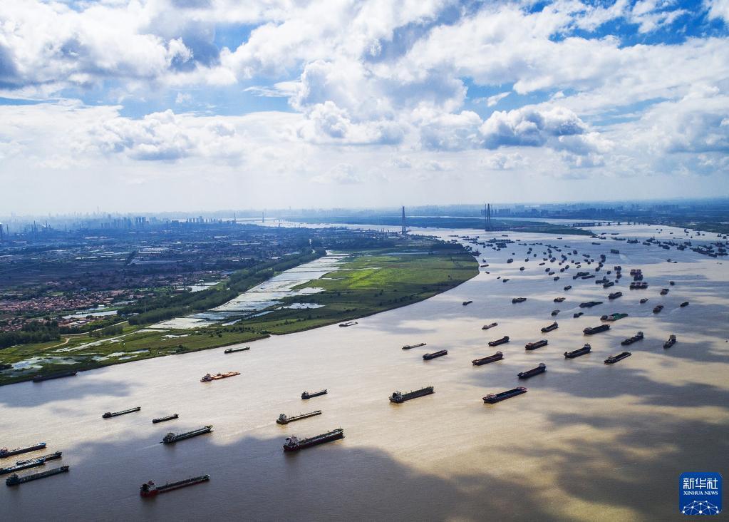 船舶在湖北省武漢市陽邏港區水域行駛(2018年8月13日攝,無人機照片)。新華社記者 肖藝九 攝