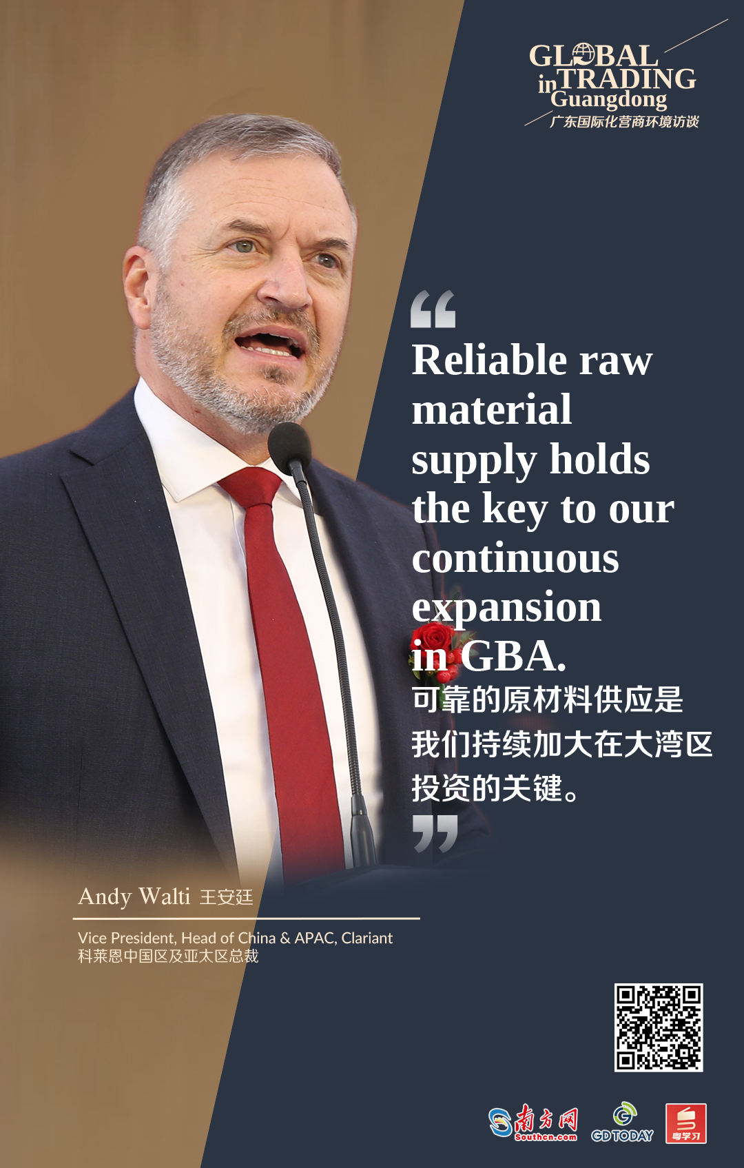 商界大咖看廣東|科萊恩中國區及亞太區總裁王安廷:可靠的原材料供應是我們持續加大在大灣區投資的關鍵