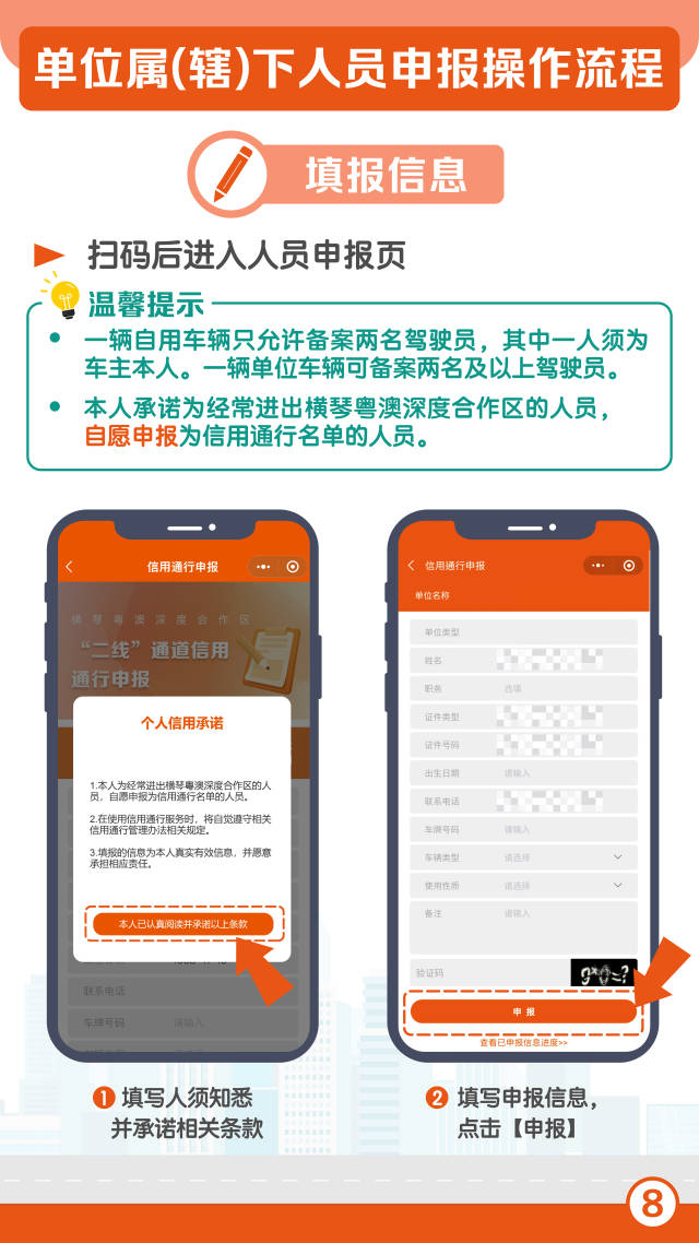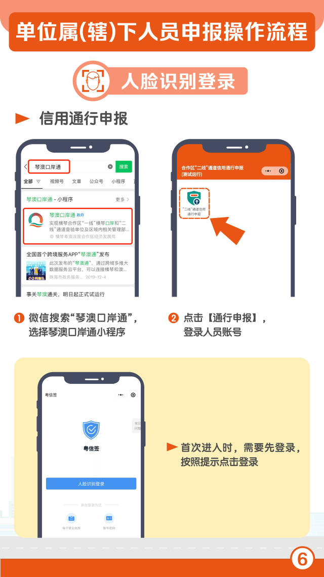 單位屬(轄)下人員可以微信搜索“琴澳口岸通”,選擇琴澳口岸通小程序,點擊“通行申報”,登錄人員賬號。人員進行身份認證登錄成功后,再次點擊“二線”通道信用通行申報按鈕,掃描單位提供的二維碼進行申報。而合作區橫琴戶籍居民或持有橫琴居住證的居民,則可以通過所轄社區居委會提供的二維碼進行申報。