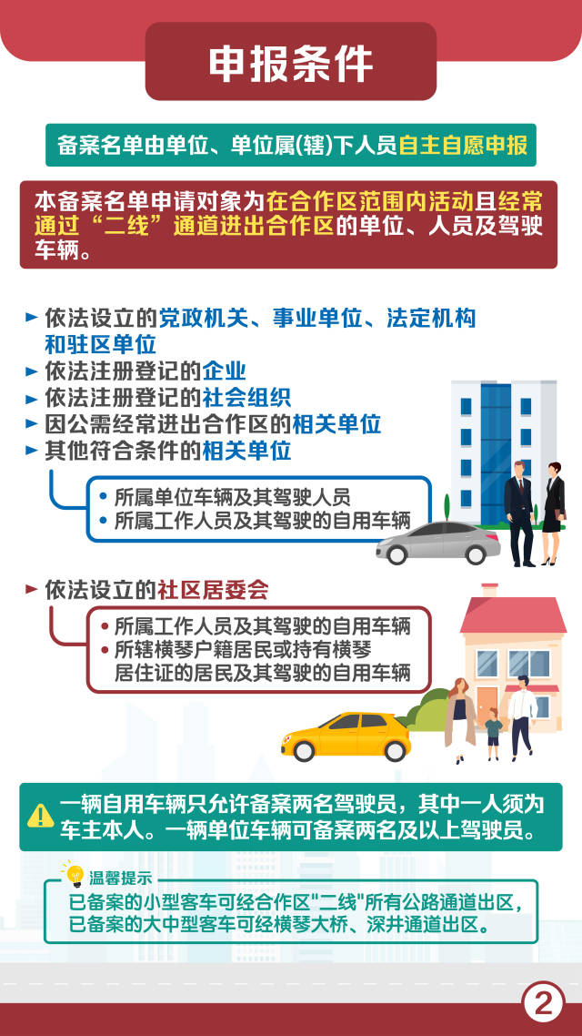 本備案名單申請對象為在合作區范圍內活動且經常通過“二線”通道進出合作區的單位、人員及駕駛車輛。具體來看,包括依法設立的黨政機關、事業單位、法定機構和駐區單位,依法注冊登記的企業,依法注冊登記的社會組織,因公需經常進出合作區的相關單位,其他符合條件的相關單位(所屬單位車輛及其駕駛人員、所屬工作人員及其駕駛的自用車輛),依法設立的社區居委會(所屬工作人員及其駕駛的自用車輛、所轄橫琴戶籍居民或持有橫琴居住證的居民及其駕駛的自用車輛)。