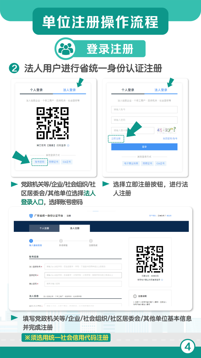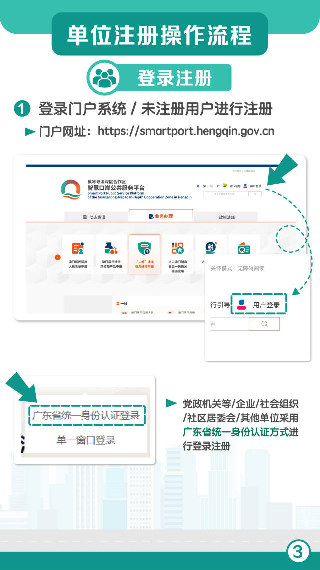 合作區相關單位可以通過智慧口岸公共服務平臺(https://smartport.hengqin.gov.cn)進行登錄注冊,黨政機關等、企業、社會組織、社區居委會、其他單位采用“廣東省統一身份認證”方式進行登錄注冊。同時,生成單位申報碼,實現“一單位一碼”,單位下載后給予用戶進行掃碼信息申報。