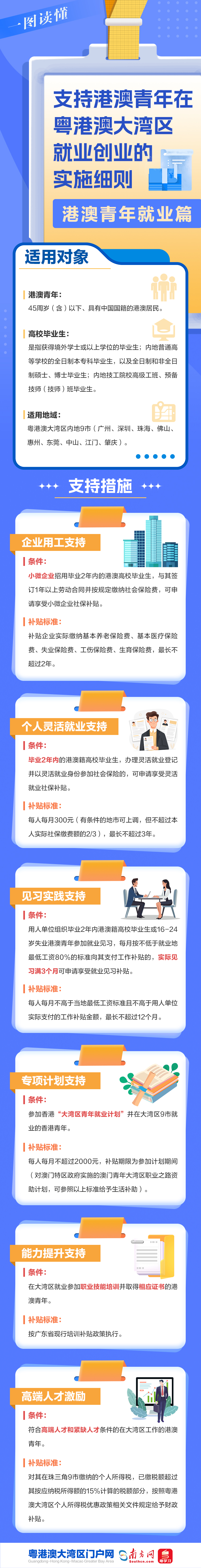 近日,《支持港澳青年在粵港澳大灣區就業創業的實施細則》正式出臺。該政策旨在通過 “真金白銀”的補貼與實實在在的服務,切實降低港澳青年在內地發展的門檻與成本。港澳青年們,這份政策圖解為你盤點了在大灣區大展宏圖的多種“著數”,速來查收!
