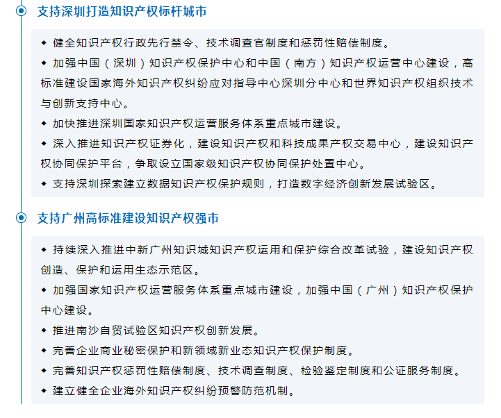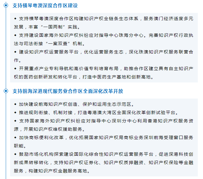 一是支持橫琴粵澳深度合作區(qū)、前海深港現(xiàn)代服務(wù)業(yè)合作區(qū)和中新廣州知識(shí)城全面強(qiáng)化知識(shí)產(chǎn)權(quán)創(chuàng)造、運(yùn)用、保護(hù)、管理和服務(wù)全鏈條,構(gòu)建知識(shí)產(chǎn)權(quán)創(chuàng)造、保護(hù)和運(yùn)用生態(tài)系統(tǒng),率先建設(shè)知識(shí)產(chǎn)權(quán)創(chuàng)造、保護(hù)和運(yùn)用生態(tài)示范區(qū)。