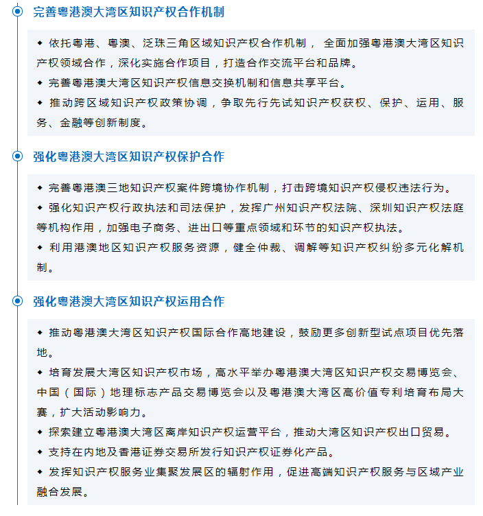 《規(guī)劃》提出,強(qiáng)化粵港澳大灣區(qū)知識(shí)產(chǎn)權(quán)保護(hù)和運(yùn)用合作。要求完善粵港、粵澳知識(shí)產(chǎn)權(quán)合作機(jī)制,大力提升粵港澳大灣區(qū)知識(shí)產(chǎn)權(quán)保護(hù)和運(yùn)用合作水平。包括以下具體任務(wù):